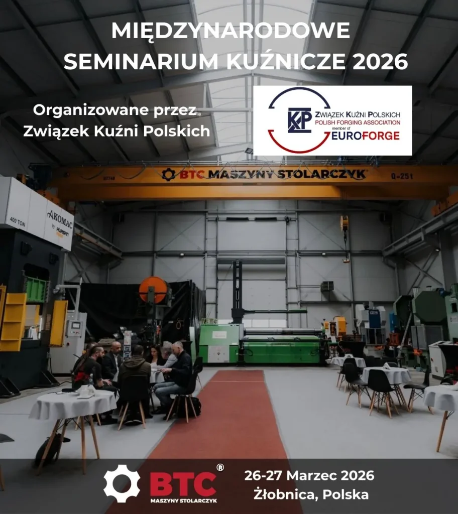W dniach 26–27 marca 2026 roku w siedzibie BTC Maszyny w Żłobnicy odbędzie się spotkanie Związku Kuźni Polskich (ZKP). To jedno z najważniejszych wydarzeń branżowych dedykowanych sektorowi kuźnictwa w Polsce, skupiające przedstawicieli zakładów produkcyjnych, dostawców technologii oraz ekspertów technicznych.